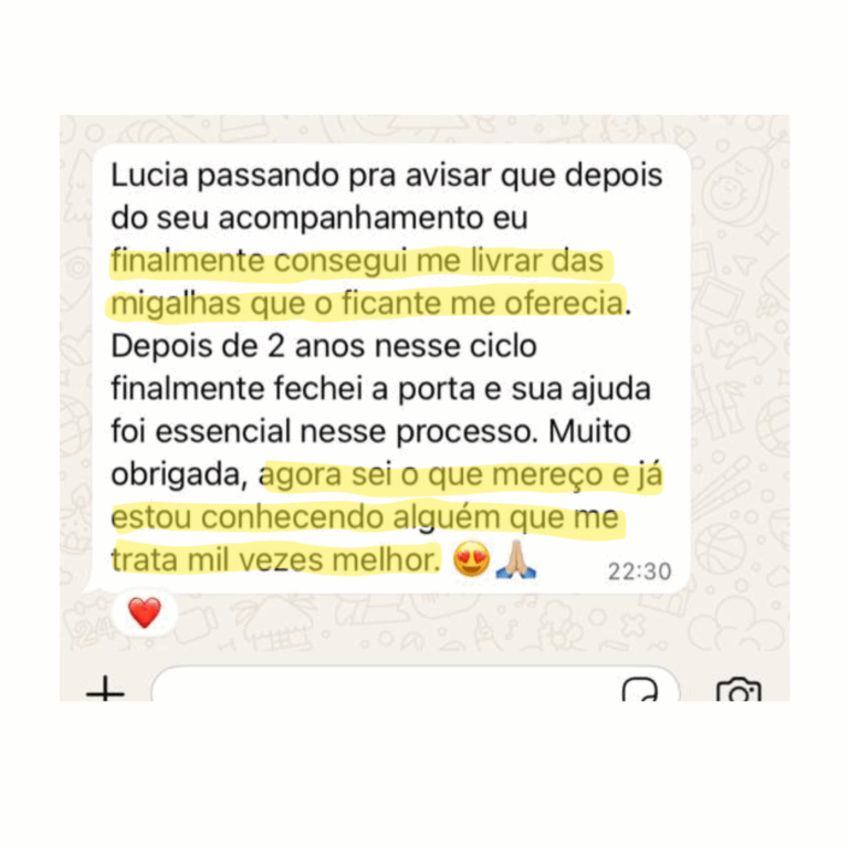 Aqui eu quero saber tudo que já aconteceu ou está acontecendo na sua vida amorosa, antigos relacionamentos, traumas e frustrações. Totalmente livre de julgamentos, vamos estabelecer nossa relação de confiança e analisar o seu cenário juntas.